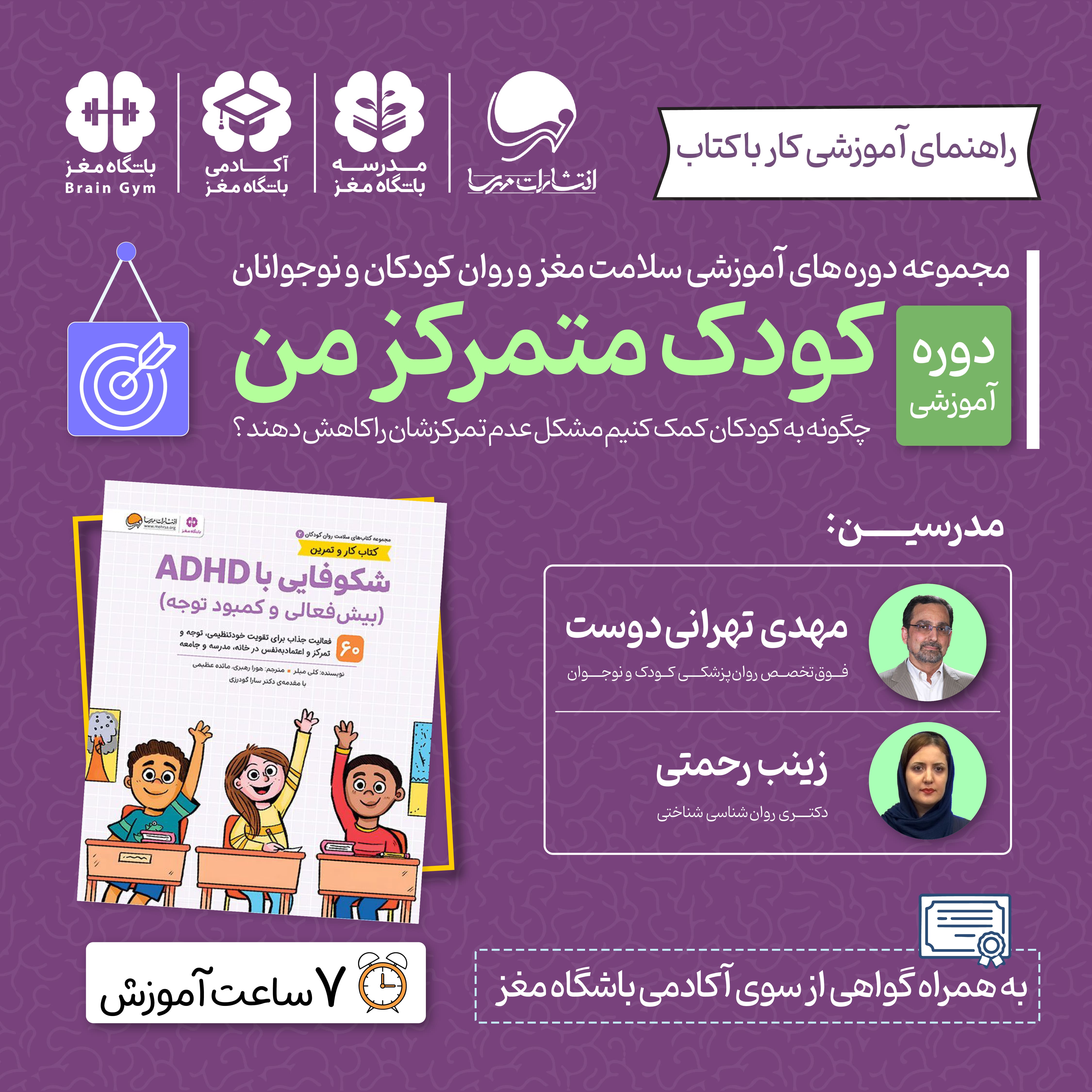 دورهی «کودک متمرکز من» با الهام از رویکرد علمی و تمرینهای عملی کتاب شکوفایی با ADHD، به والدین، مربیان و روانشناسان کودک و نوجوان دانشجویان روانشناسی و علوم تربیتی کمک میکند تا با نگاهی عمیقتر و روشی کاربردی، به بهبود تمرکز، خودتنظیمی و رشد تحصیلی و هیجانی کودکان کمک کنند.