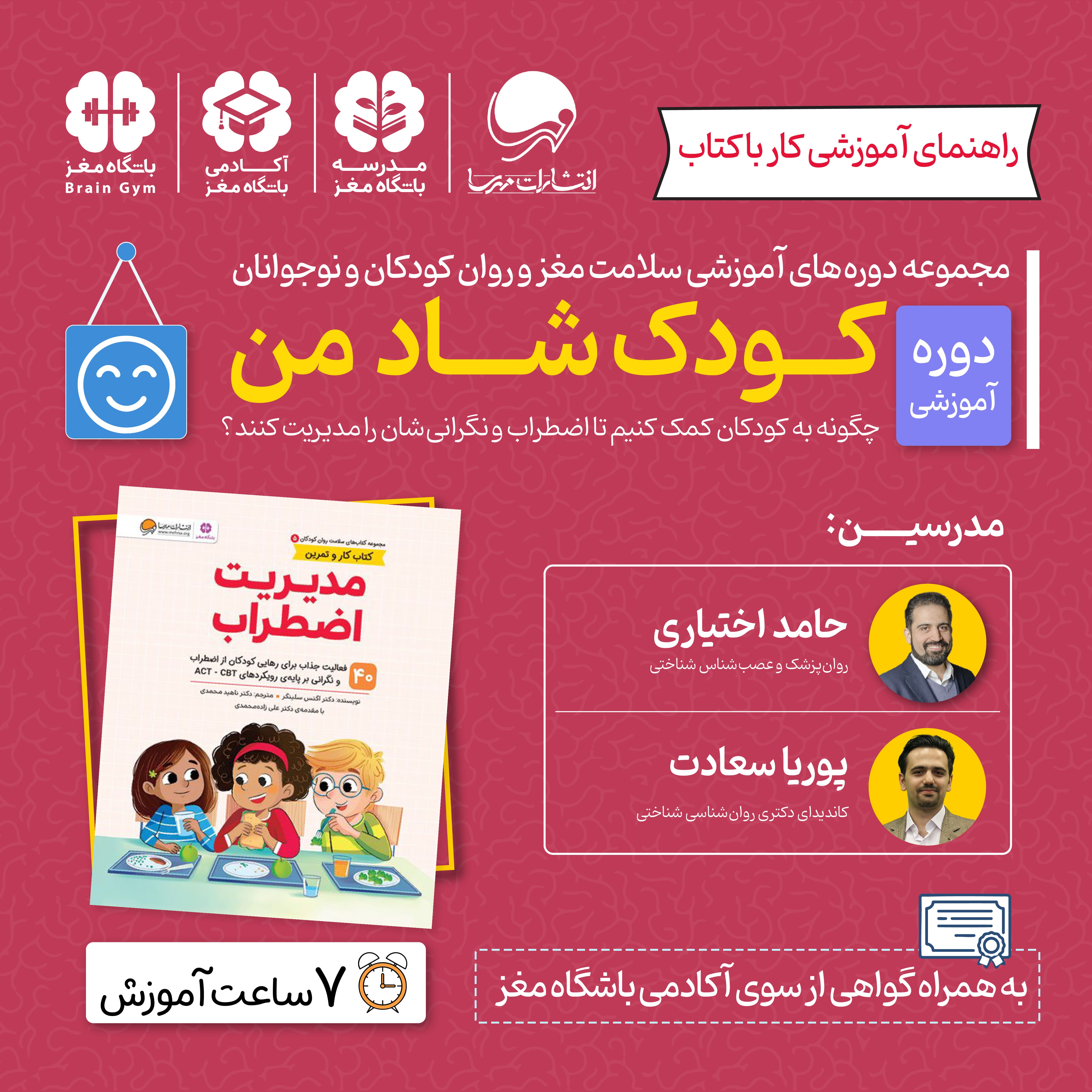دورهی «کودک شاد من» با بهرهگیری از تمرینهای علمی و کاربردی کتاب مدیریت اضطراب، به والدین، مربیان، مشاوران و دانشجویان روانشناسی کمک میکند تا به کودکان بیاموزند چگونه احساسات خود را در موقعیتهای مختلف بشناسند و مدیریت کنند.